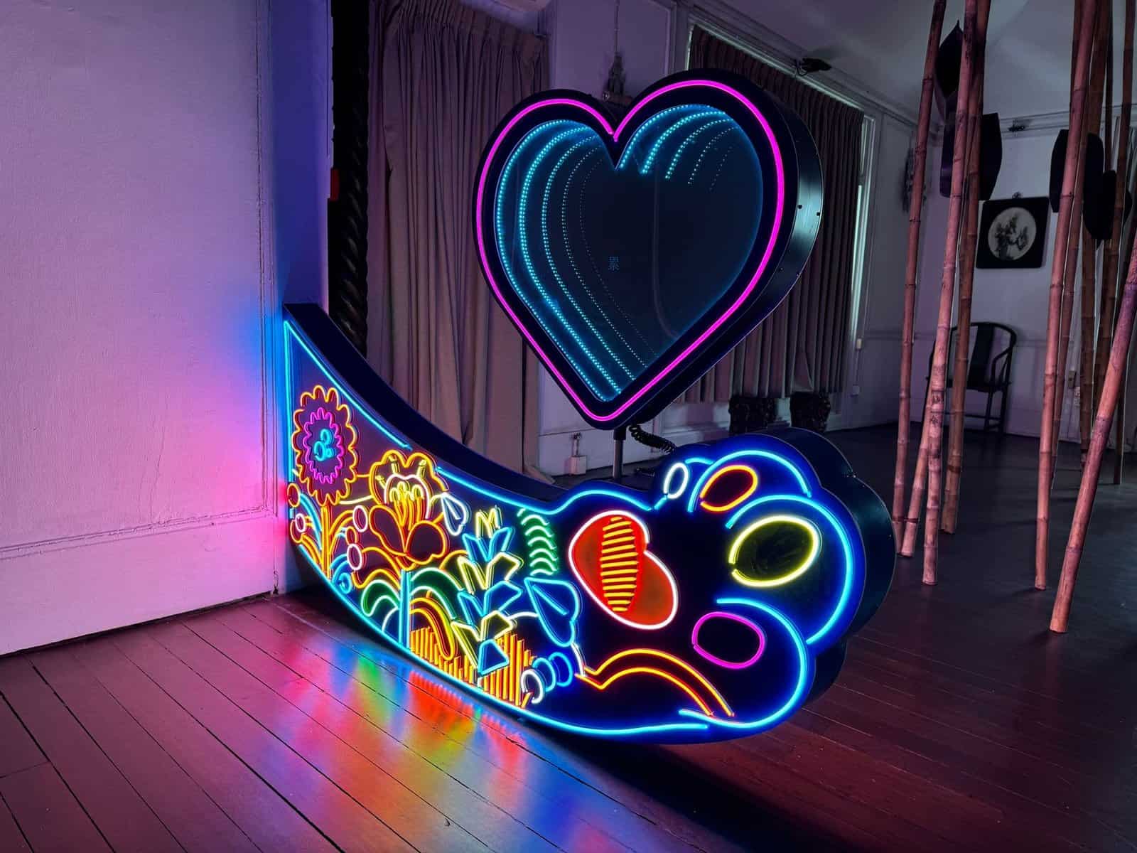 Header image: Roy Wang, Touch the cat Series Rest (2024), aluminium frame, neon LED tubes, hydraulic motor device, stainless steel rod, infinity mirrored box with LED light tracks, and video projection mapping on window with sound motion. Image courtesy of Temenggong Artists-in-Residence.