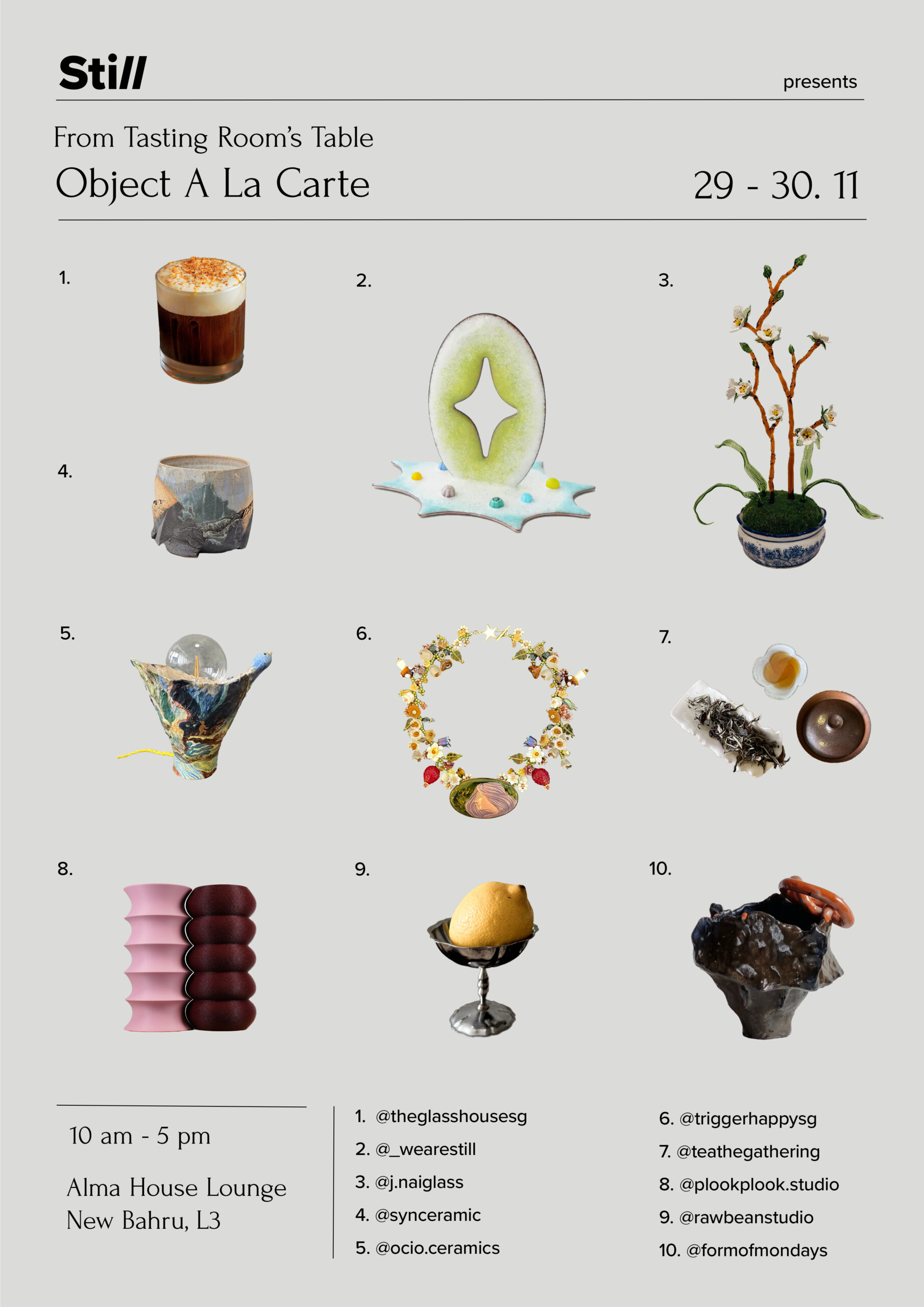 A curated selection of everyday works by local artists, designers, and brands. These objects embody Still’s ethos: tactile, thoughtful, and beautifully functional pieces that elevate daily life. 🔹featuring🔹 foRM of Mondays | ceramic @formofmondays Glasshouse | coffee @theglasshousesg J.Nai | glass @j.naiglass Reg Bautista | ceramic @ocio.ceramics PLOOK PLOOK | 3D […]