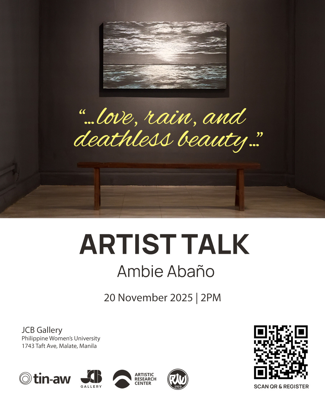 Ambie Ambie Abaño Artist Talk for “love, rain, and deathless beauty…” Nov 20 2:00 pm - 4:00 pm Ambie Ambie Abaño Artist Talk for “love, rain, and deathless beauty…” Free