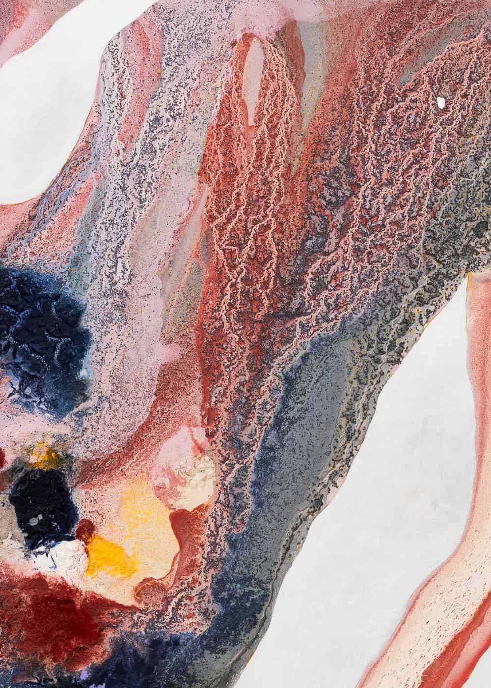 The Earth Laughs in Flowers is a continuation of this body of work, with some new technical developments. Beyond the pigments used in Into Air, Ng has now introduced sand and sediment into her multilayered ice blocks. The resulting undulating forms, Ng explained to us excitedly, are the culmination of endless trials and investigations — studying the materials’ melting rates, colours, and consistencies, and how they react with other substances. She recalled how she would, with the support of her assistants, wheel ice blocks from her freezer and haul them onto strategic spots on her panels, turning her studio into a laboratory for assiduous creative research.