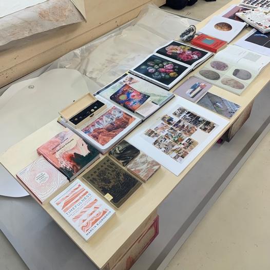Indeed, time was of the essence on that balmy day last November, in more ways than one. Ng was preparing for her solo exhibition The Earth Laughs in Flowers (currently on view at the Singapore Repertory Theatre till 31 January 2026), which would comprise 12 large-scale paintings, each corresponding to a month of the year. This studio visit, then, was a momentary pause in the eye of the storm, briefly suspending the flurry of art-making, graciously allowing us to glimpse the exhibition-to-be. Standing next to her painting January (2025) and a table full of tidily organised research materials, Ng shared with us a few words elucidating her practice.