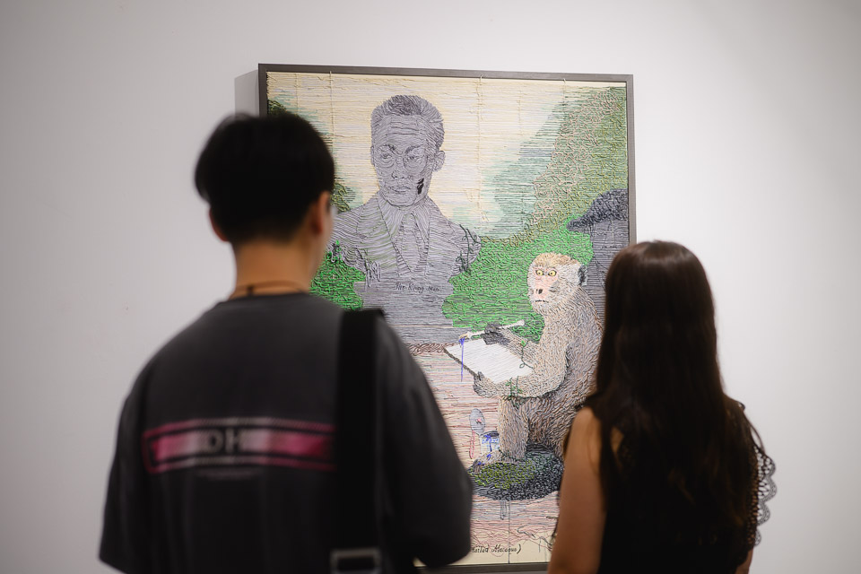 Curator Desmond Mah’s own work, Still Living Rent-Free, lagi satirical. Macaque sit there, hesitate to sketch bust of The Kiang Man (obvious lah, Lee Kuan Yew). Got AI voiceover in fake documentary style.