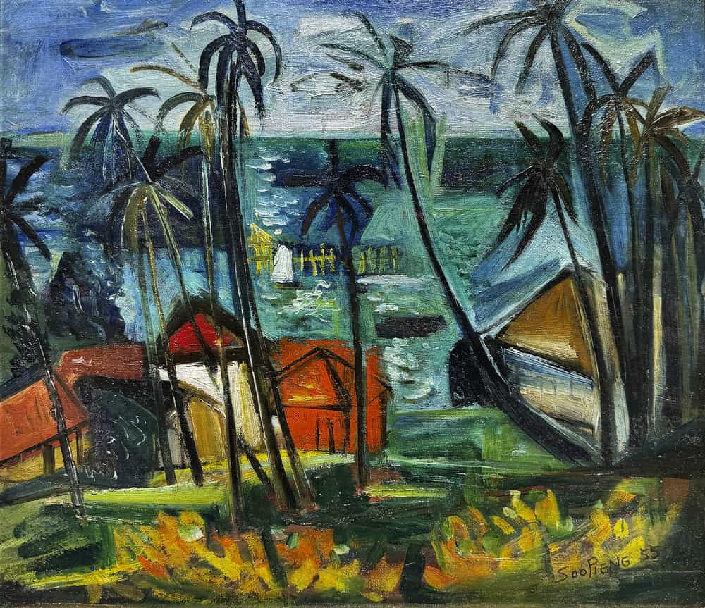In Kampong by the Sea (1955), Cheong, like his peers Chen and Yang, borrows from Western styles of treating shape and colour to depict local life. Rather than the Impressionists, however, he more clearly references the School of Paris — notably the movements Fauvism, Expressionism, and Cubism — to develop his pastoral scene.
