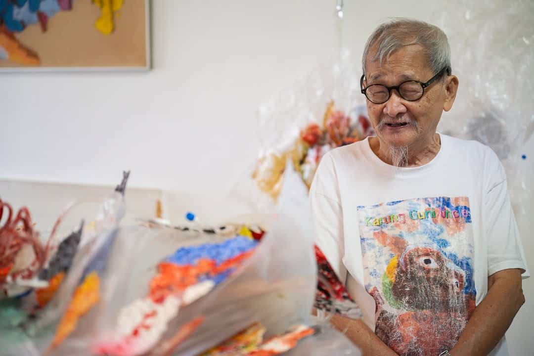 One Saturday in January, Teo welcomes us into Muse House, a two-storey Katong shophouse that serves as both residence and art gallery. Sporting a colourful t-shirt emblazoned with the words “Karung Guni Uncle” (rag-and-bone man), the artist retains every bit of the irrepressible, maverick energy that made his name in the ’70s and ’80s. We start off seated around the large square table on the first floor, but, before long, he gets up to point out the artworks around us — an abstract painting here, an assemblage made with plastic scraps there.