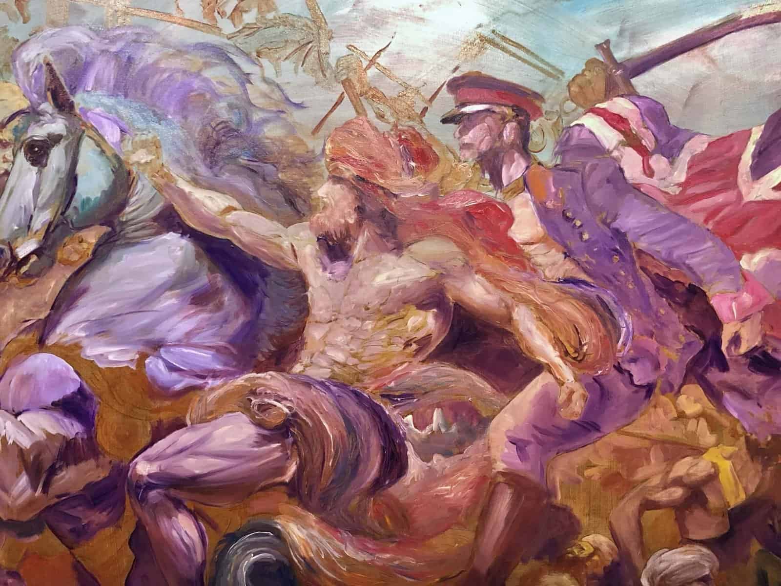 The exhibition features nine large paintings heavily influenced by the Baroque painter Peter Paul Rubens, known for his dynamic compositions, vibrant use of colour, and dramatic depictions of mythological, religious, and historical scenes. In this series, Singh depicts fictional war scenes starring heroically masculine, turban-wearing Sikh soldiers in all-out battle.