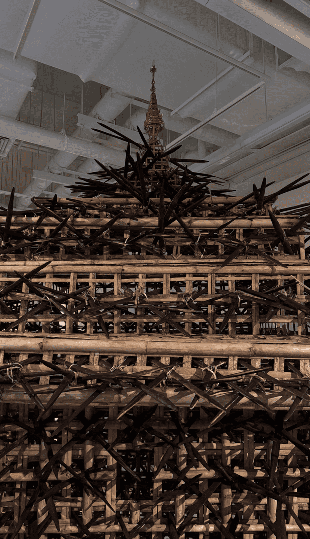 At first glance, the bamboo structure resembles a traditional pagoda, an iconic form in Myanmar’s spiritual landscape. Step closer, though, and the blackened spikes jutting from the pagoda tell another story. Reminiscent of the barricades used by Myanmar’s military junta, they speak of conflict, and a nation fighting for its future. This tension lies at the heart of Eindri’s monument to her nation.